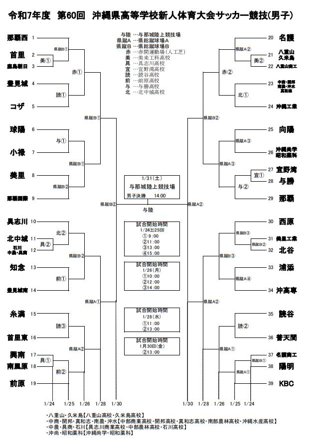 1回戦 1月24日(土) 首里 - 鹿島朝日 北中城 - 石川・中農・具商 興南 - 南風原 八重山・久米島 - 八重山商工 宜野湾 - 与勝 美里工業 - 北谷 名護商工 - 陽明 組合せ PDF版はこちら 参照:沖縄県高等学校体育連盟HP